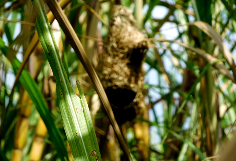 Akhirnya, setelah muter sini-sana. Kompleks manyar itu akhirnya ditemukan atas petunjuk 'pawang'. Padahal sedari awal tadi juga sudah santroni lokasi ini. Cumak gak nyana klo para Manyar itu lebih memilih lahan kebun tebu jadi areal sarangnya. Bukan sekerumun rerumput tinggi sebelahnya. Antusias Fathir meluap. Melewati batas pagar..menerobos rimbun tebu. Paling tidak kriteria resident aves ini persis sesuai jabaran wiki. Tipikal ini disebut Manyar tebu...tetap memilih dekat zona persawahan dan rada berair (wetland). Weaver Bird..kelompok burung yang mahir menganyam. Dianugrahi tabiat trik pengalih bagi kelompok pemangsa-nya, dengan membuat lorong celah ekstra disarang.